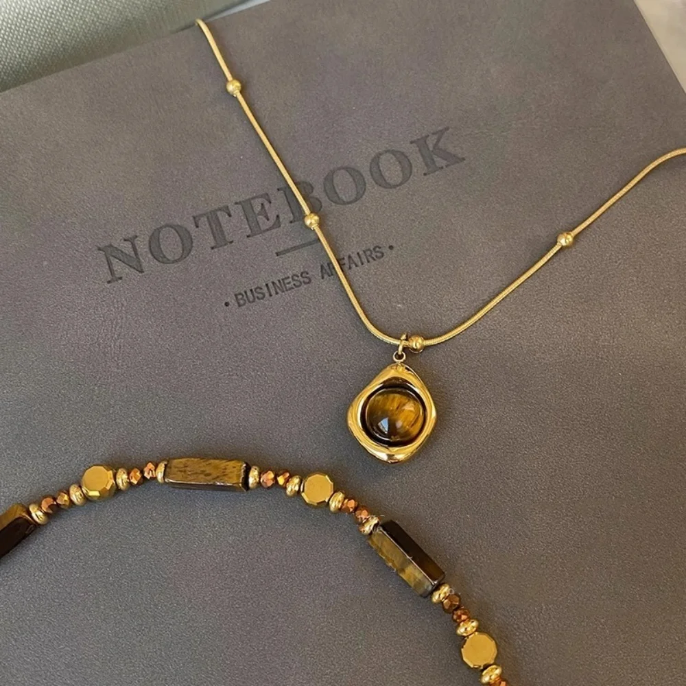 Alloy double-layer collarbone chain set jewelry retro temperament layered tiger eye stone pendant necklace for women